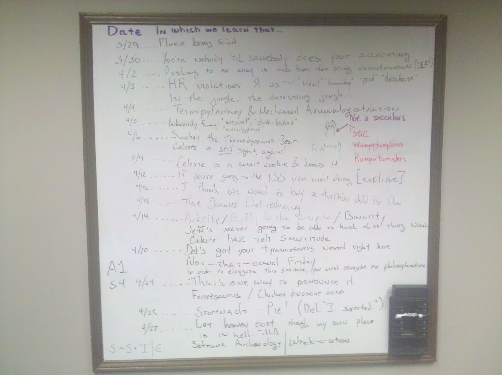 | 4/3 | HR violations R us ~ "meat" "penmanship" "prod" "database" |